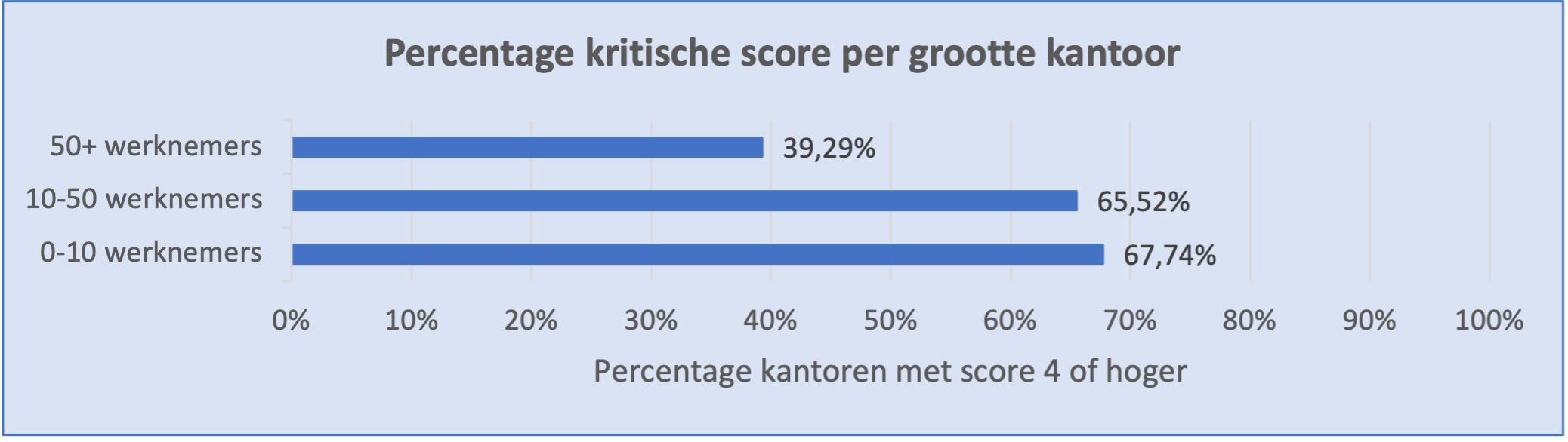 Zoals te zien is heeft ongeveer 65-70% van de kantoren met 0-10 en 10-50 werknemers een score van 4 of hoger. Van de kantoren met meer dan 50 werknemers, is dit slechts 40%. Een aanzienlijk verschil. Grote kantoren doen het dus beter op het gebied van cyberweerbaarheid.